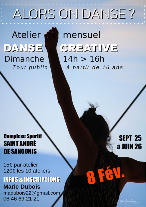 Pas de technique, juste la découverte de son propre corps en mouvement selon ses possibilités pour goûter au plaisir de sa danse. En groupe, en duo-trio et en solo, autour d’un thèmedifférent proposé à chaque atelier. Je propose un espace d’exploration pour se mettre en mouvement : une invitation à créer, jouer, partager, avec authenticité et sans attente de résultat. « Ressentir » plus que « Comprendre » Etre à l’écoute et être présent à ses sensations. Réveiller sa créativité, son imaginaire, sa poésie, sa gestuelle, se mouvoir et s’émouvoir. Une proposition à la fois individuelle et collective pour mener sa danse pas à pas !