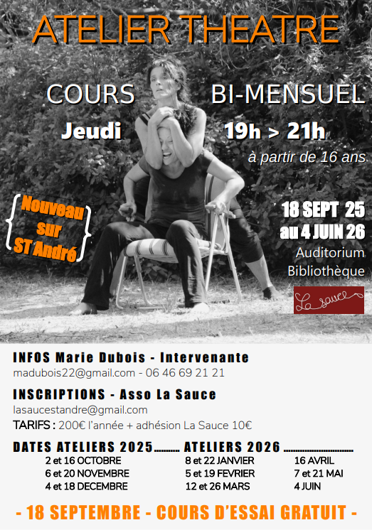 Deux jeudis par mois, de 19h à 21h, La Sauce propose un atelier autour du jeu du comédien. Cette pratique associe travail vocal et corporel : respiration, élocution, expression, conscience du corps et de l’espace, improvisation.